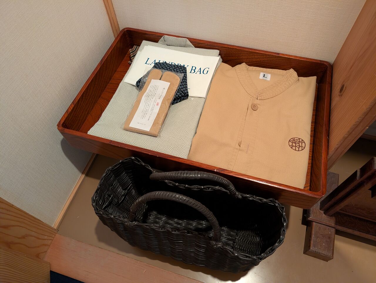 戸棚には浴衣と丹前、パジャマ。タオル用の籠。