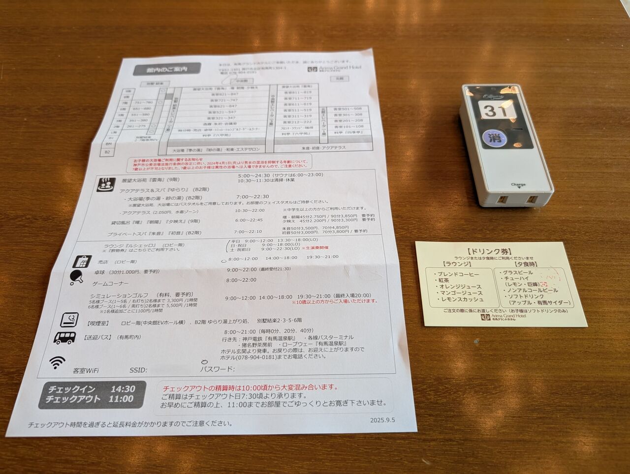 それに対して渡されたのが、館内案内とドリンクチケットと呼び出しベル。