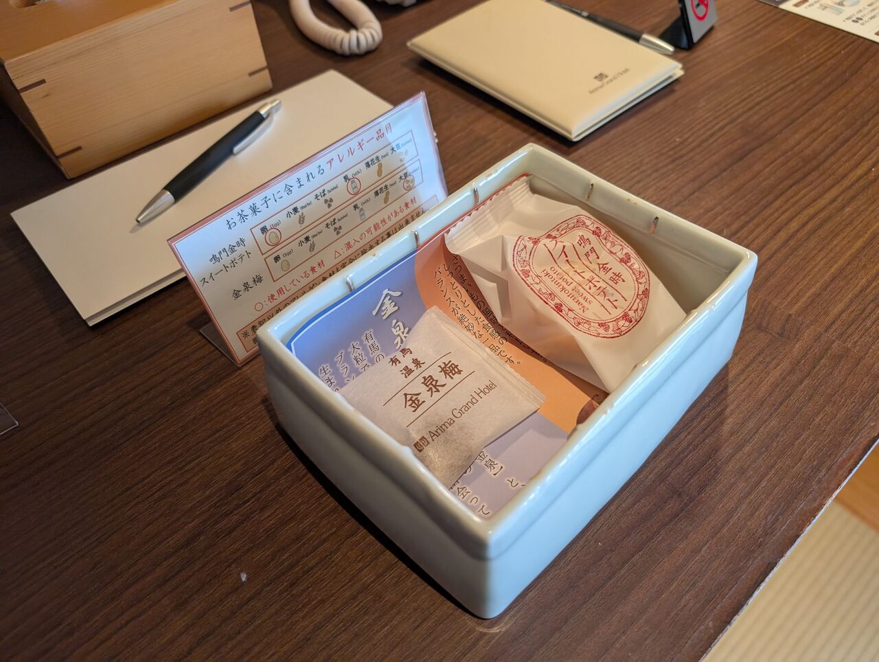 部屋菓子、金泉梅と鳴門金時スイートポテト。