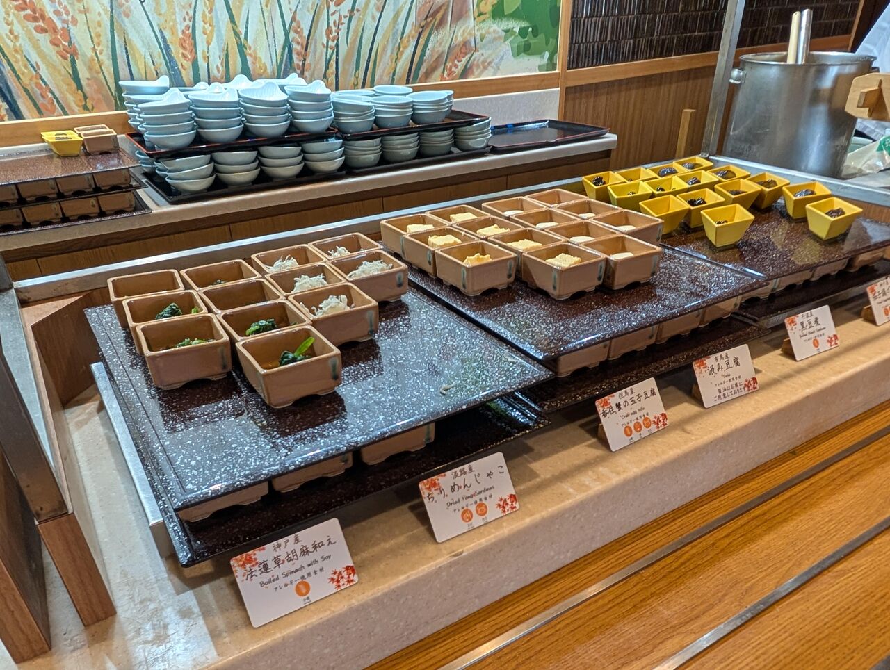 法蓮草胡麻和え、ちりめんじゃこ、香住蟹の玉子豆腐、汲み豆腐、黒豆煮、茄子揚げ浸し